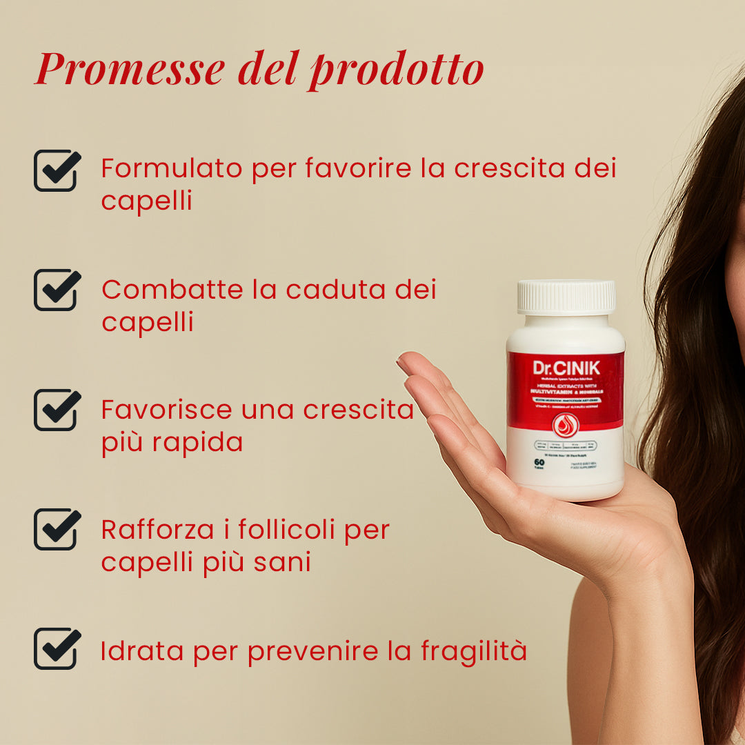 Un integratore alimentare quotidiano completo formulato per supportare la crescita sana dei capelli dall’interno.