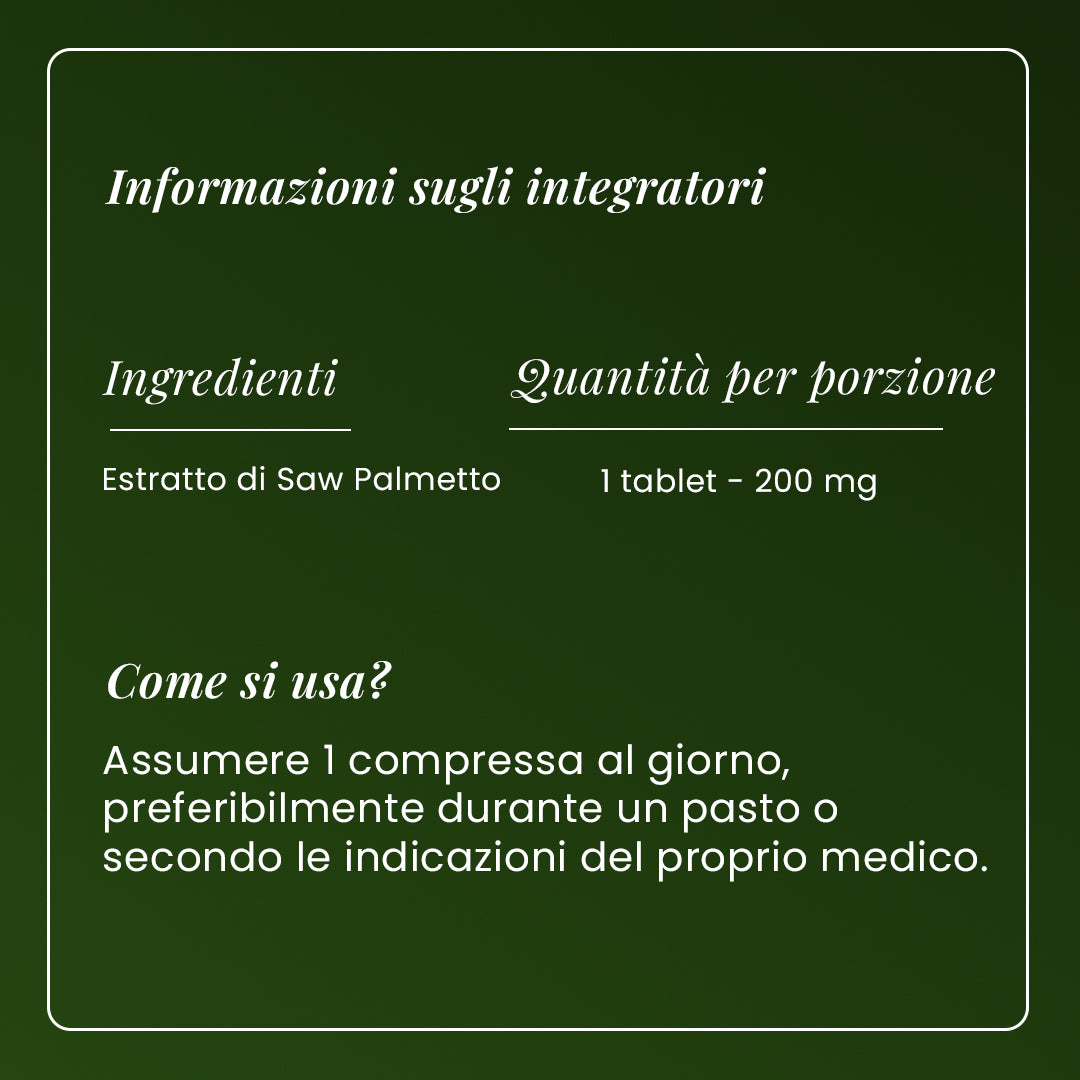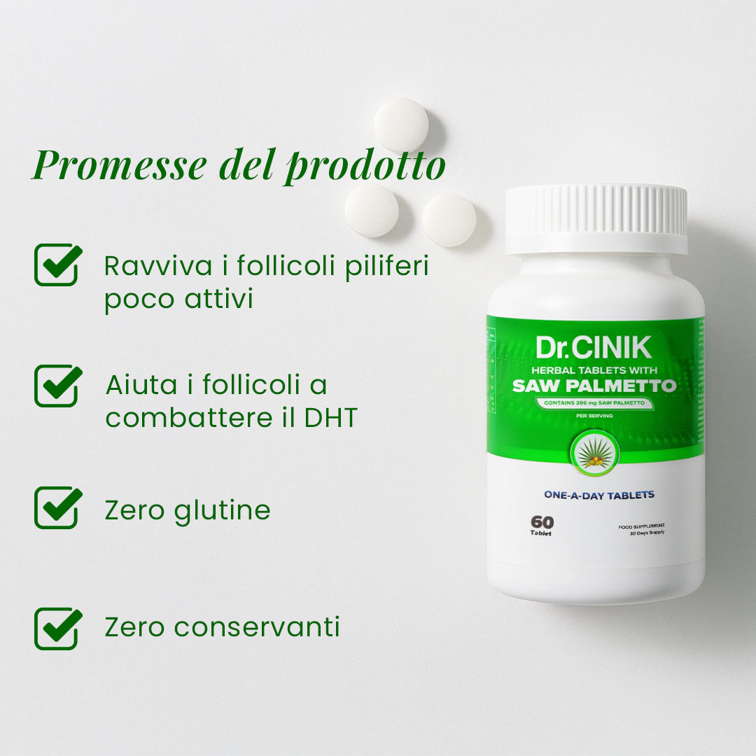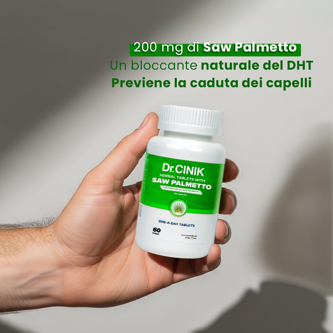 Ogni dose giornaliera fornisce 200 mg di Saw Palmetto, un noto ingrediente botanico che aiuta a ridurre l’attività del DHT — il principale fattore ormonale legato alla caduta dei capelli androgenetica.